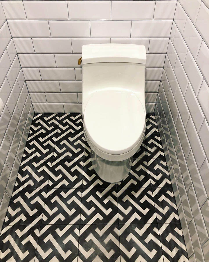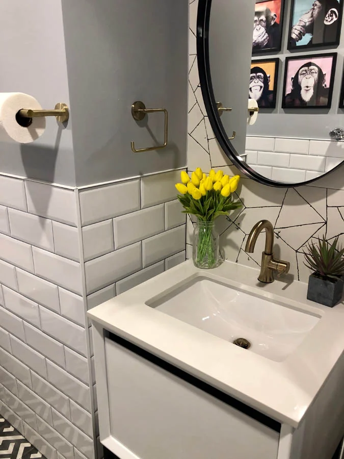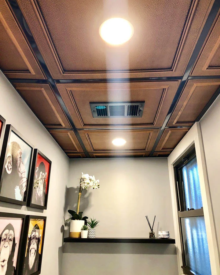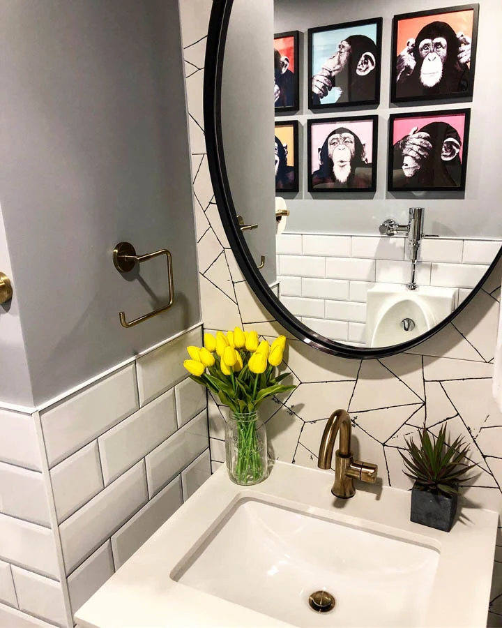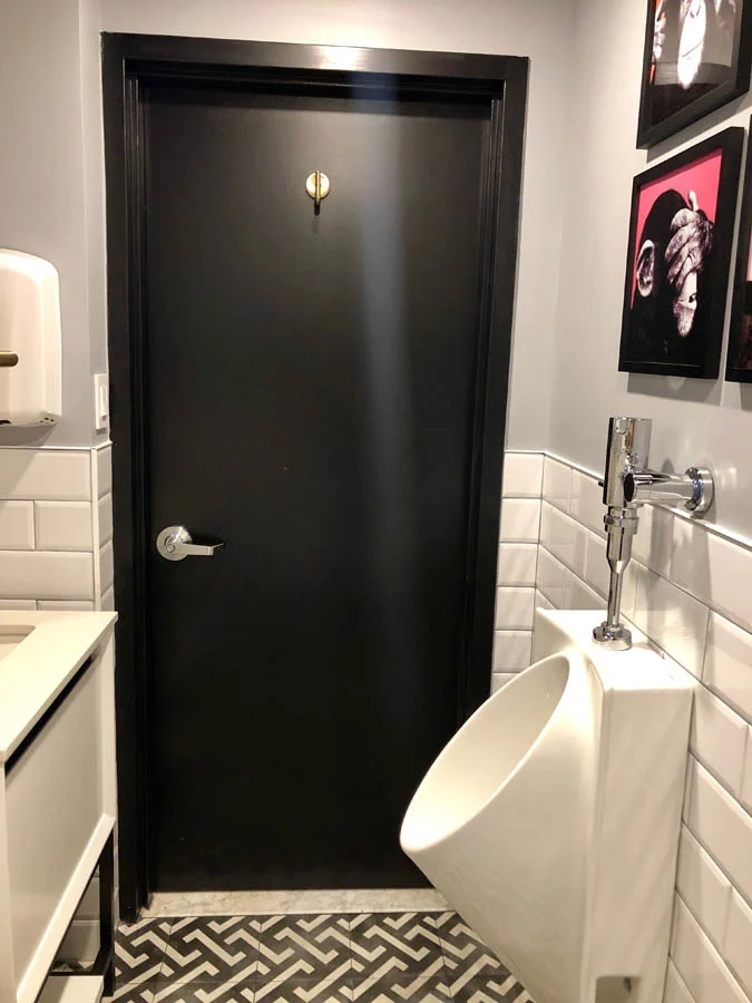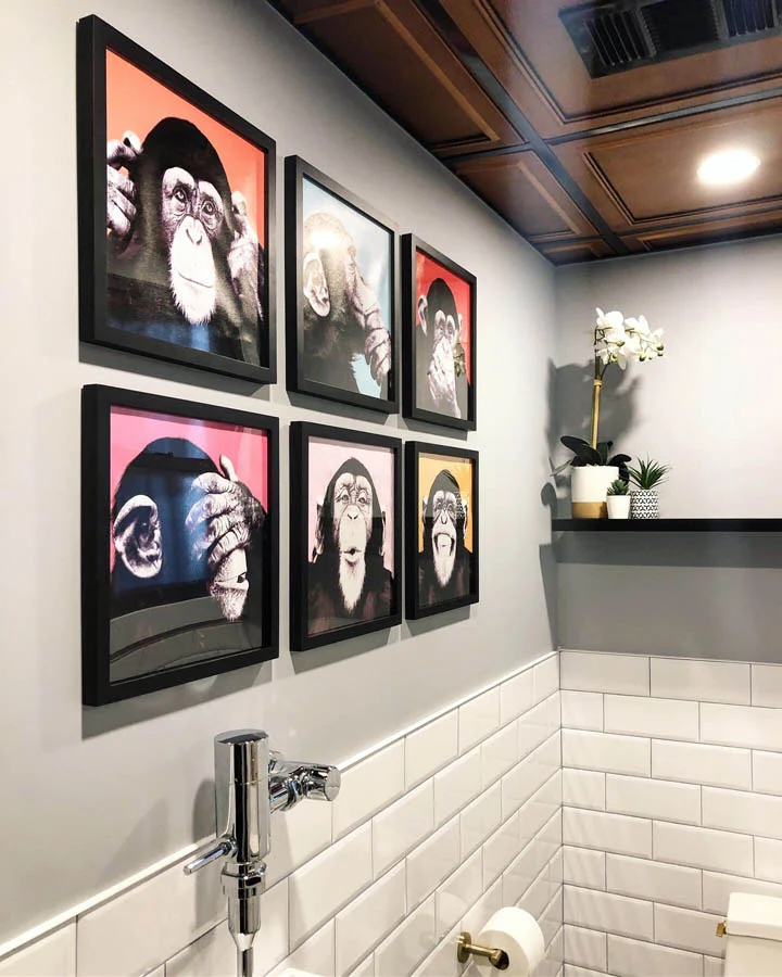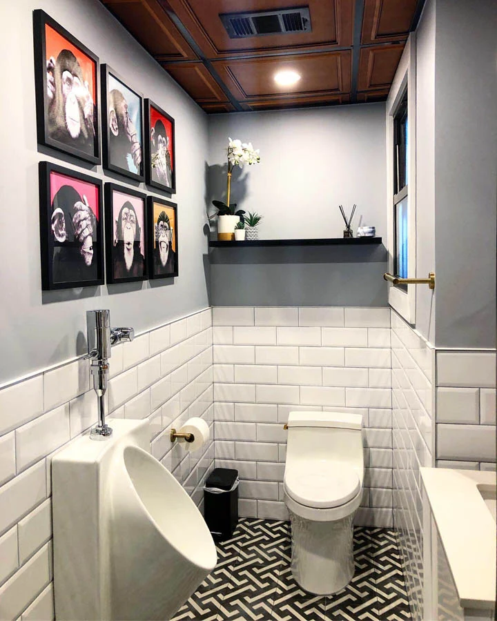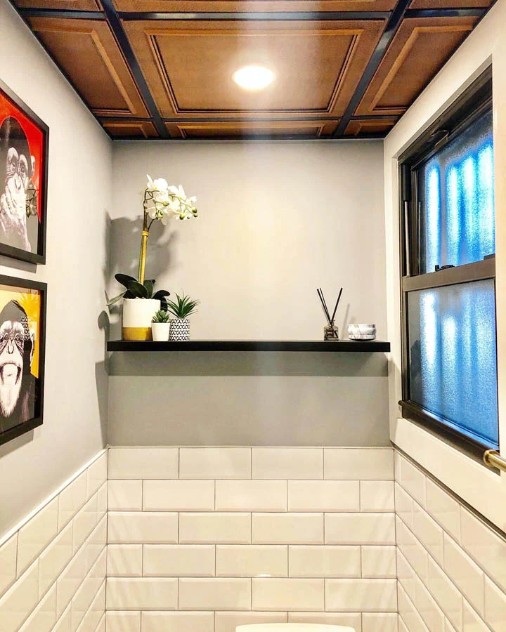 A small bathroom in an office space gets a redesign with sleek new fixtures, new tiles, a new faux coffered ceiling and fun artwork and accessories.