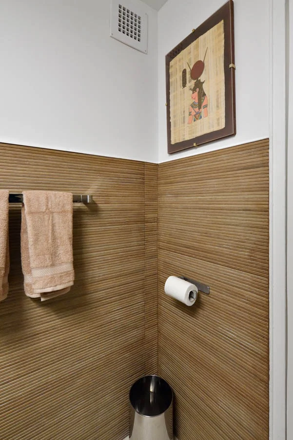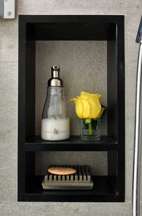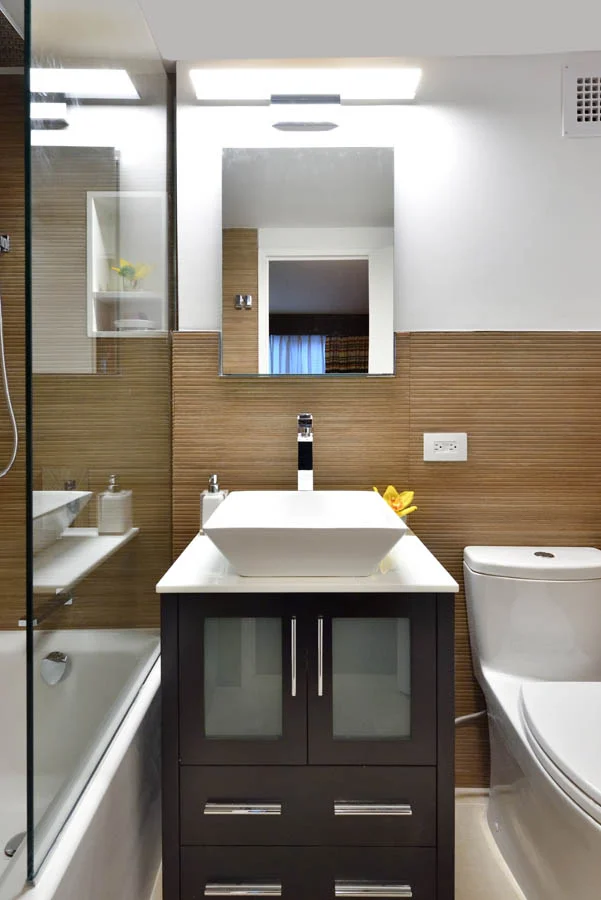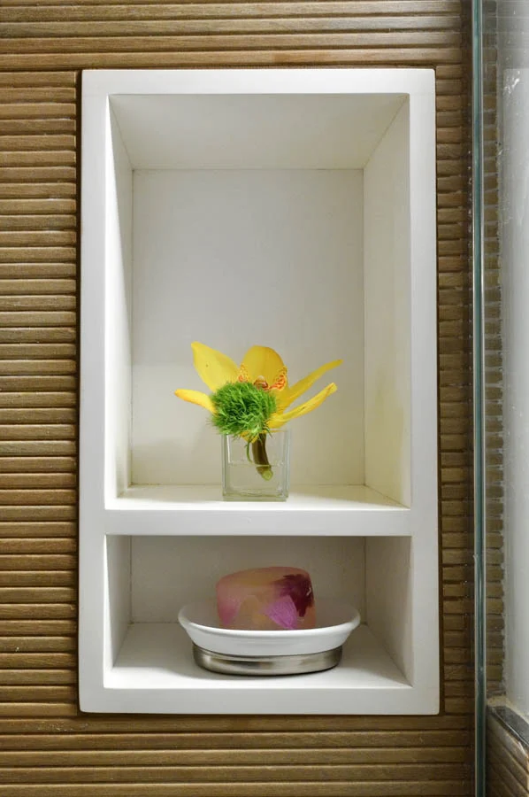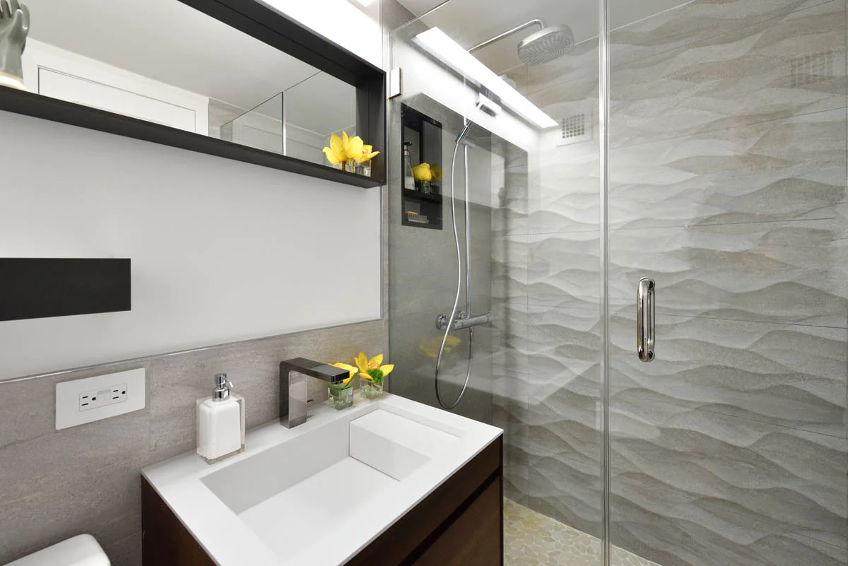 A pair of bathrooms in Gramercy Park come to life with a combination of modern clean lines and intense moments of texture.