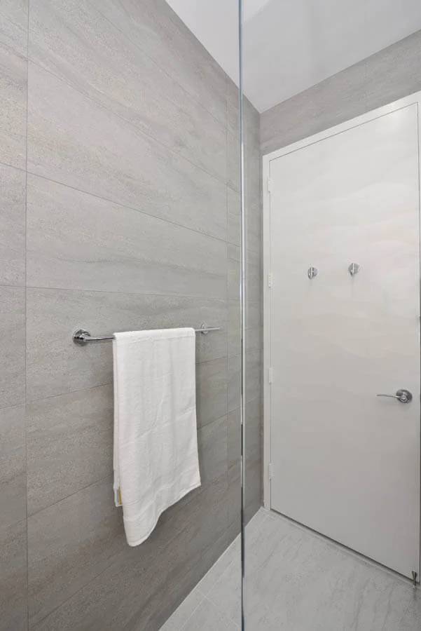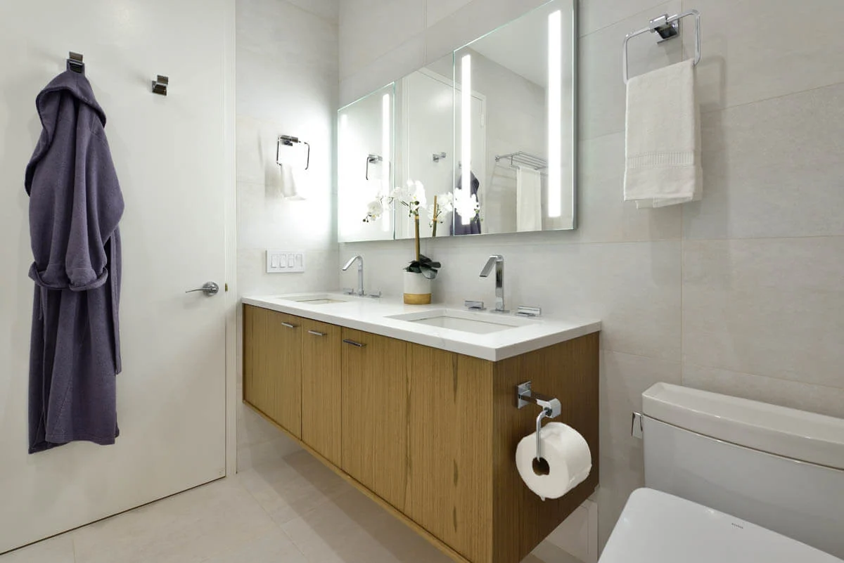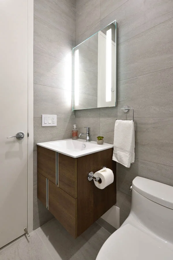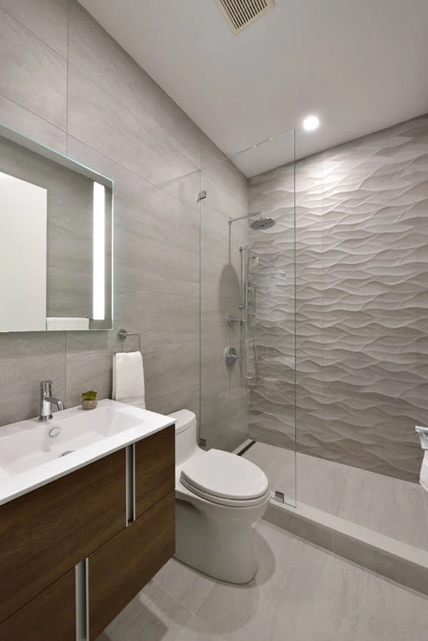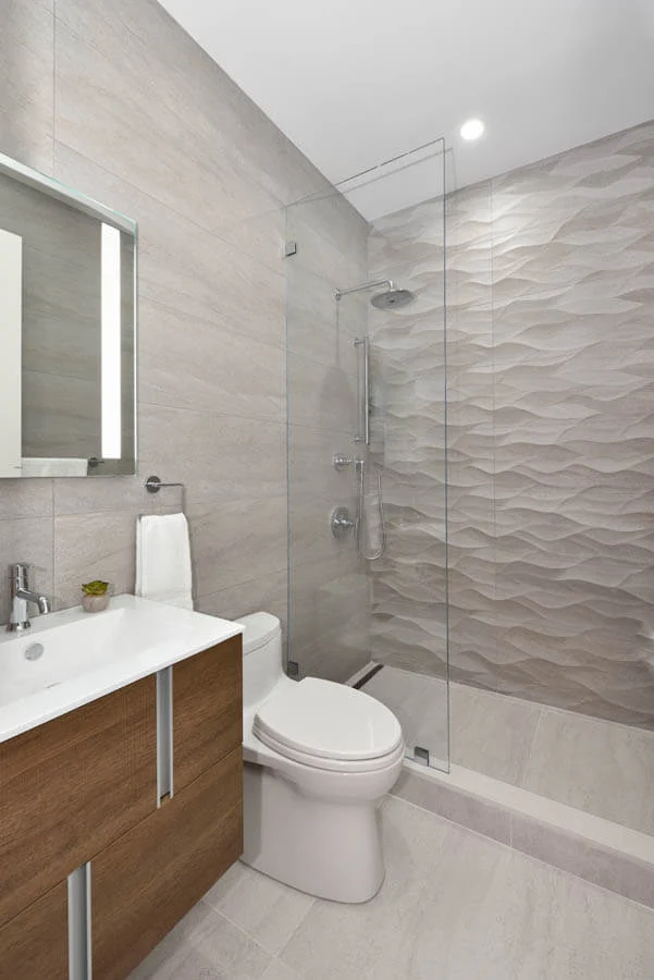 Two bathrooms were given a stunning update in this upper east side apartment. This beautiful wavy tile has been a popular selection this year, and each time it brings new a different charm to these spaces.