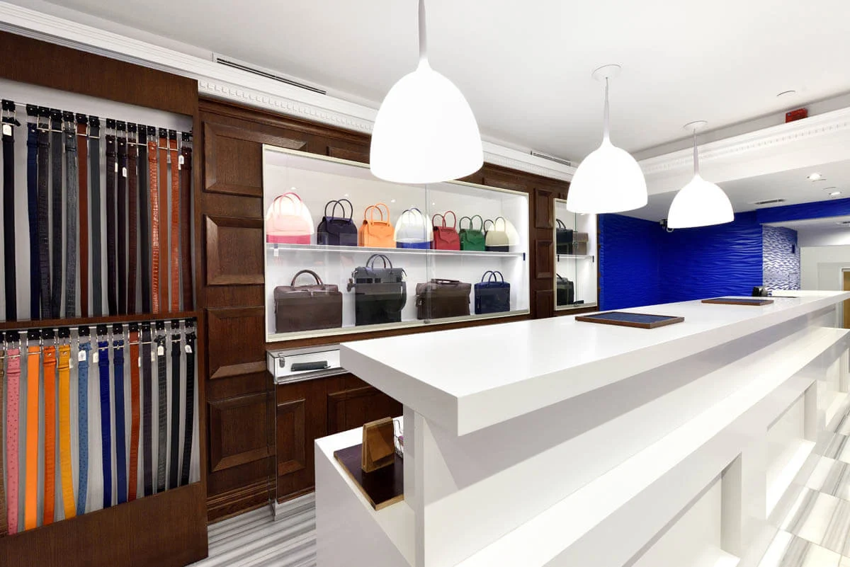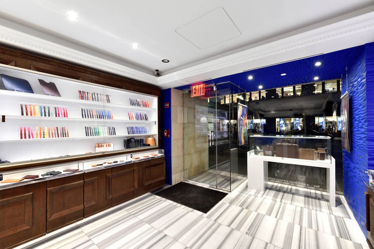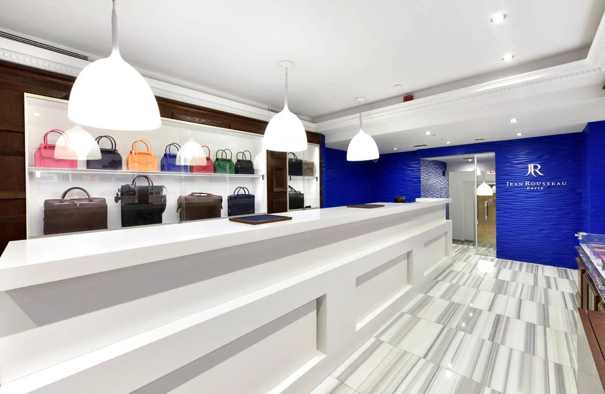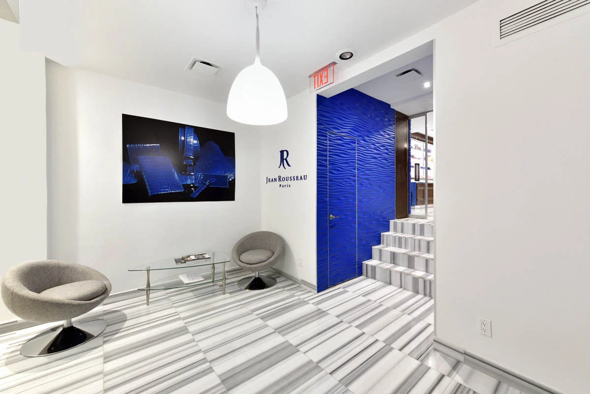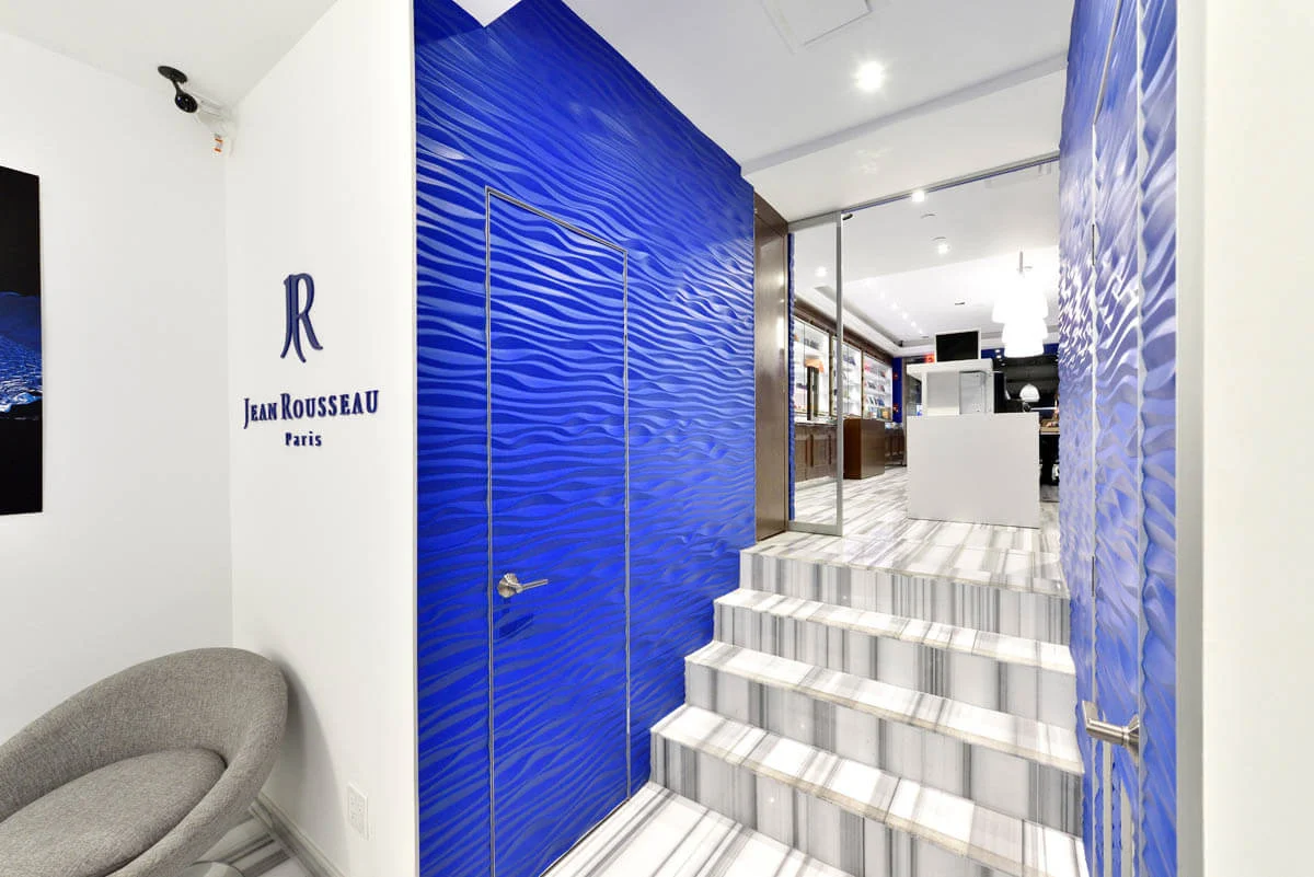 This commercial space was tailored specifically for the client to showcase their line of accessories. Brilliant blues and textured finishes make it a tactile and bold space.